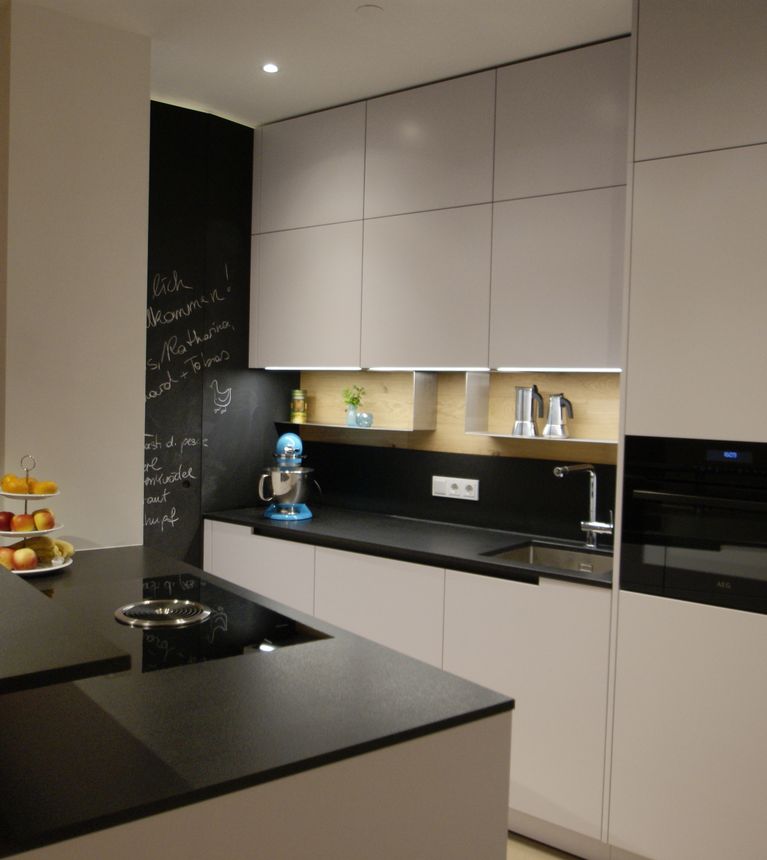 Durch den Grundriss mit einer trapezförmigen Küche ergab sich ein kleiner Abstellraum. Dieser wurde mit einer pfiffigen Tafelwand abgetrennt.