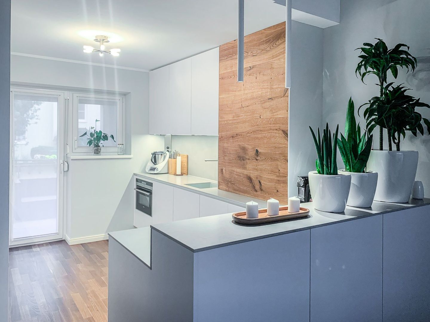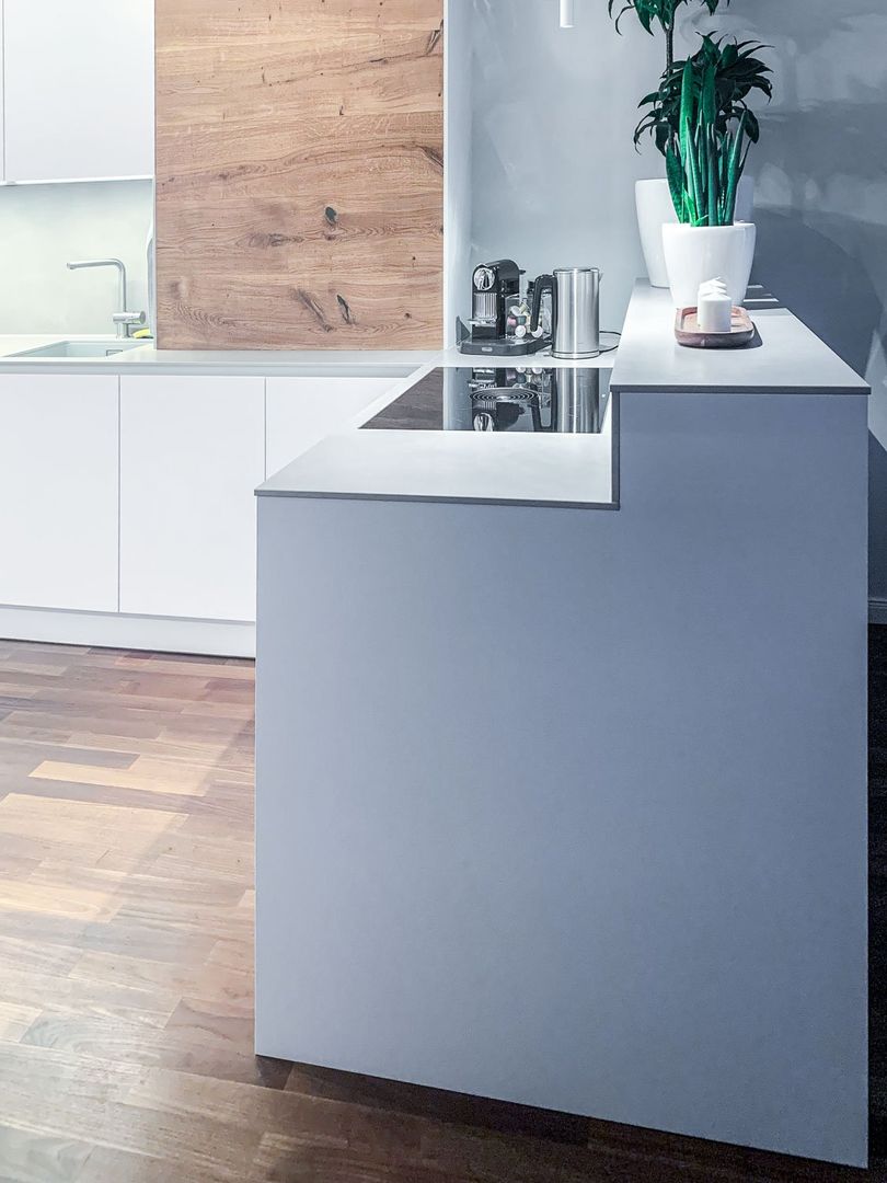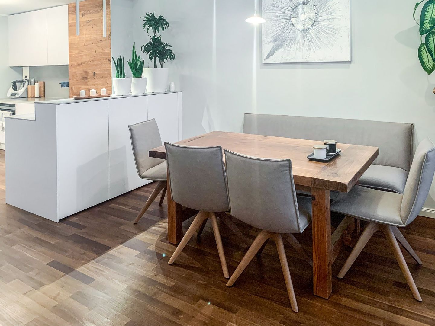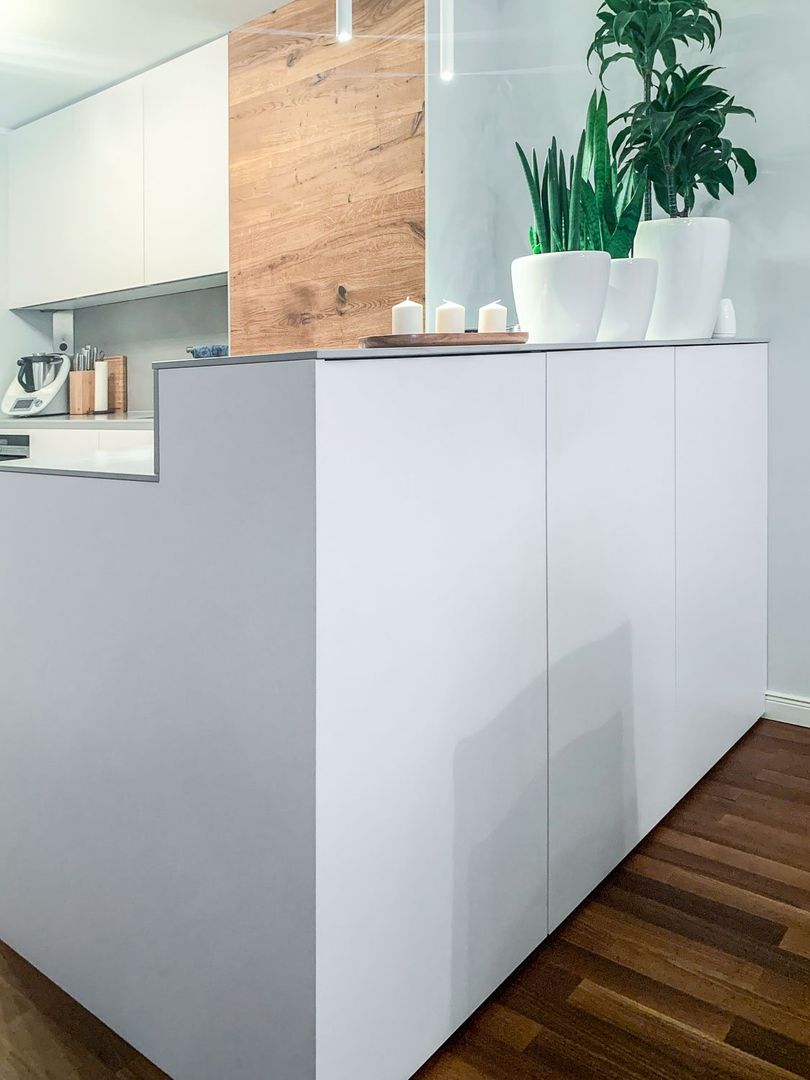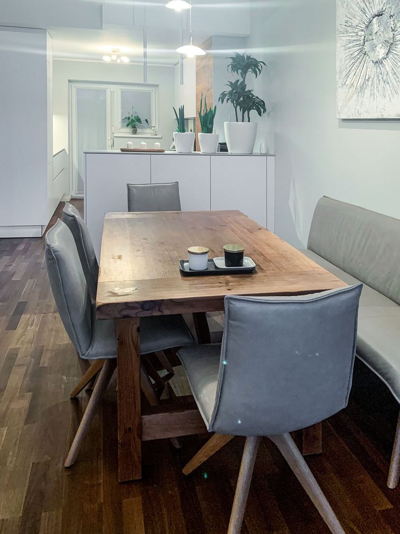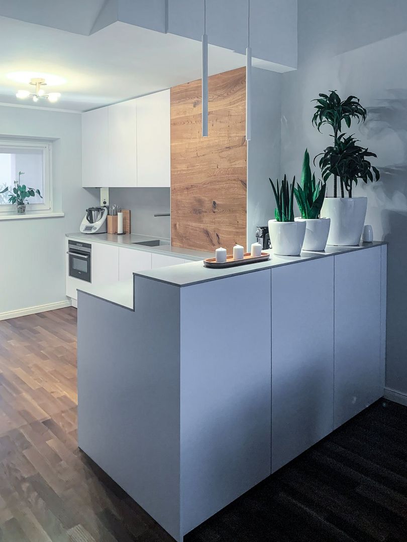schlichtes Weiß/Grau trifft auf Holz