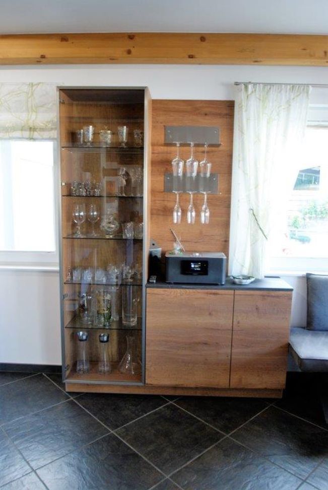 Bei dieser Küche zieht sich das Holzdekor wie ein roter Faden durch die Planung. Abgestimmt auf den dunklen Fliesenboden fügen sich die Holzelemente harmonisch in den Raum. Die Küchenschränke rücken durch die weiße Oberfläche in den Hintergrund und überlassen dem Holz und den dunklen Elementen den Vortritt.