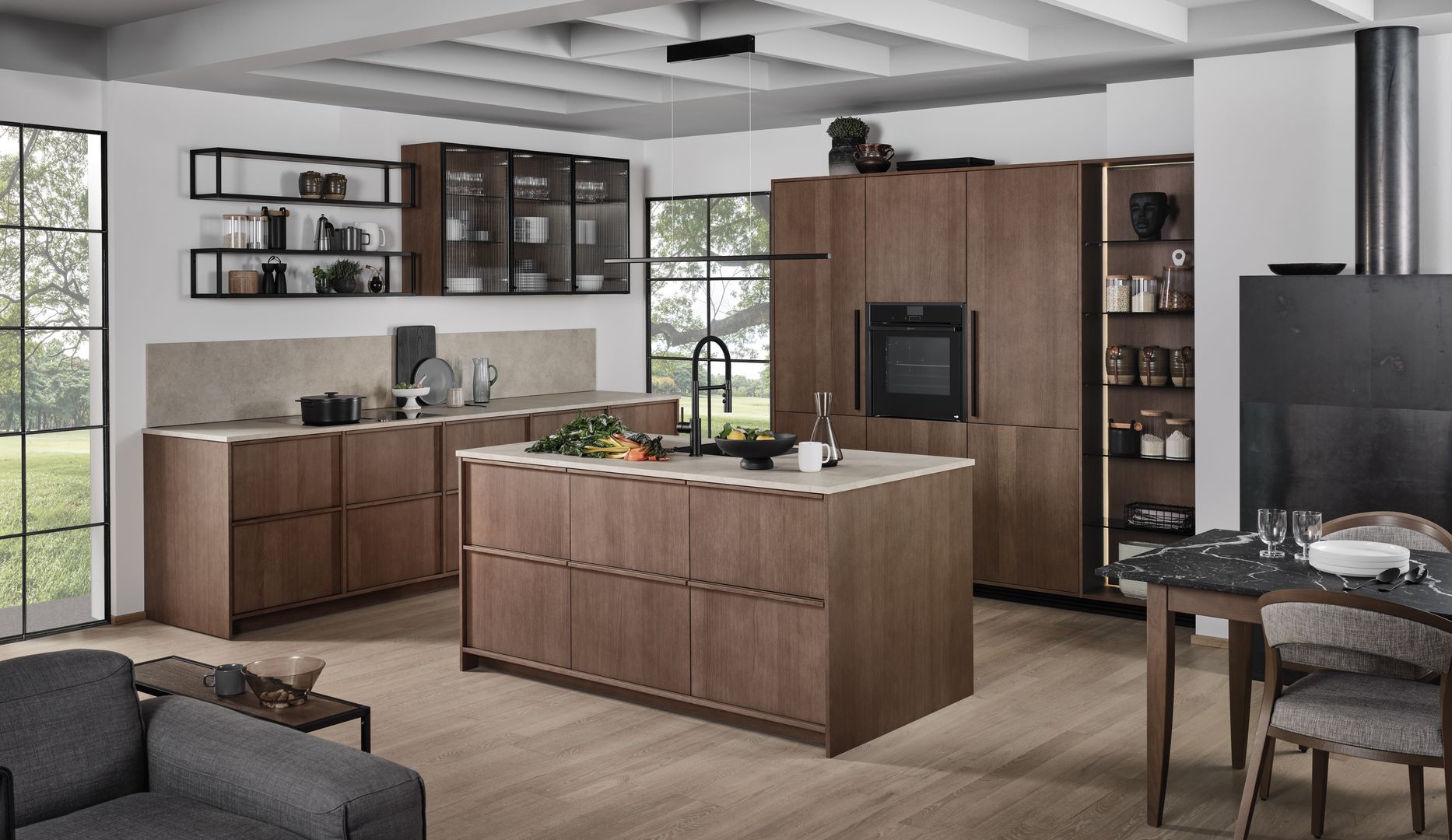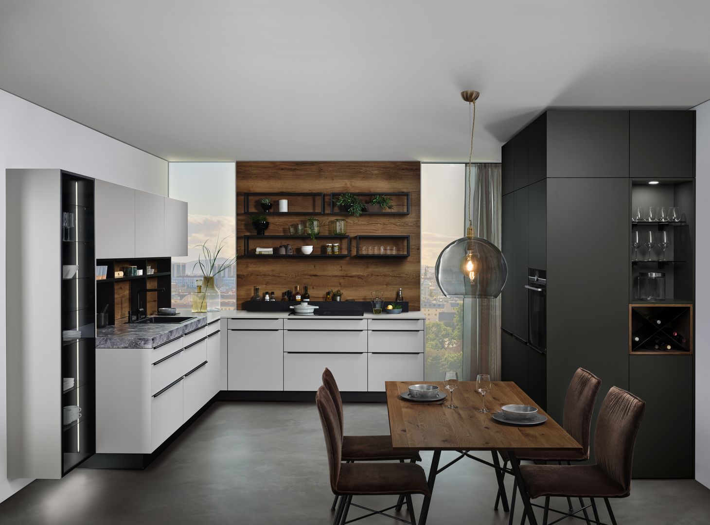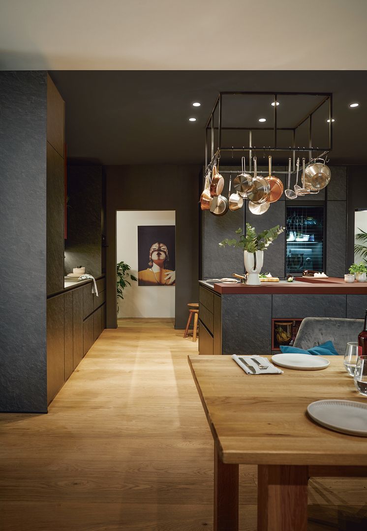 Wie sieht die Küche in den 2020-er Jahren aus? Eines ist klar: Sie ist offen für Neues. Offenes Wohnen ist so aktuell wie nie zuvor, und die einzelnen Lebensbereiche verschwimmen. In der Küche wird gearbeitet, gustiert und gekostet, auch gegessen, gechillt und verweilt. Das nicht mehr so wie vor einigen Jahren meist in klinischem Weiß, sondern in eher dunkleren Tönen. Dabei reicht der Bogen von Anthrazit über Mitternachtsblau und Tannengrün bis zu dunklen Hölzern, in die sich immer wieder ein neuer, leichter Rosé Ton mischt und für frischen Wind sorgt. Diese Farbwelt ist oft matt, in Anti-Fingerprint Optik, meist grifflos und mit vielen praktischen Details gespickt. Es gibt unzählige Varianten, um typische Küchenhelfer verschwinden zu lassen, die dann mit einem Handgriff sofort parat sind. Die Zeiten, in denen die Küche offensichtlich mit ihren technischen Hilfsmitteln geprahlt hat, sind Schnee von gestern. Alle Linien sind klar und puristisch. Die Küche beeindruckt als stylishes Designmöbel und Blickfang zugleich.